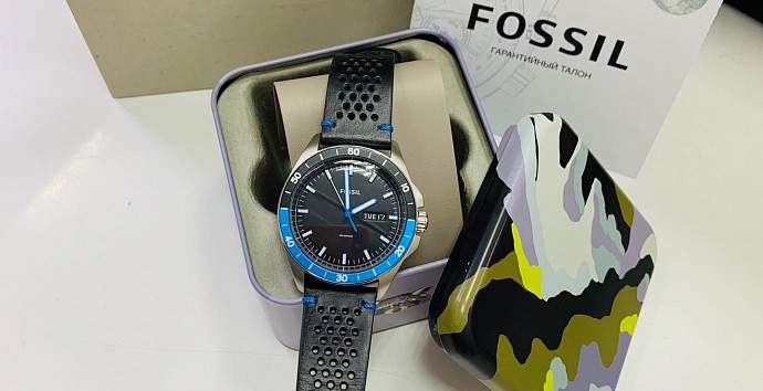 Модель Fossil Sport 54 Three-Hand Day-Date Black Leather Watch часы из серии Sport 54. Спортивный стиль, с элементами ретро дизайна. Круглый корпус из нержавеющей стали, кожаный ремешок с перфорацией. Безель с цветной шкалой. Отображение текущей даты и дня недели в аналоговых часах. Защита заводной головки